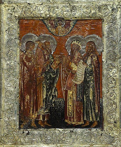 Дерево; паволока; левкас; темпера; серебро, тиснение; гравировка; золочение. 32,2×27,5, общий вес – 1244,1 г. Соловецкий музей-заповедник. КП-1755