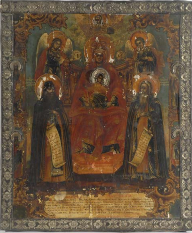 Краткое описание: в центре изображена Богоматерь с Младенцем на престоле, по сторонам в рост – святые Антоний и Феодосий Печер ские, за престолом – два ангела. Вверху – «облачный» Саваоф. На бо ковых полях изображены в рост четыре пророка: слева – Моисей и Иезекииль, справа – Исайя и Даниил. На нижнем поле – картуш с текстом молитвы. По краям – чеканный оклад с цветочным орнамен том. Шесть чеканных венцов.