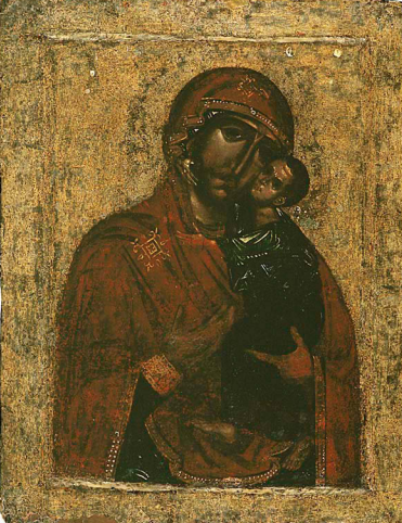 Сохранность. Доски скреплены двумя поздними врезными встречными шпонками. Повсеместные утраты авторского олова фона. Значительные утраты красочного слоя на одеждах, руках и ступнях младенца. Первоначальная живописьв наибольшей степени сохранилась на ликах1 .