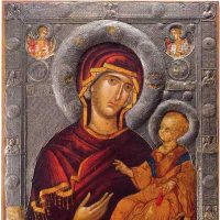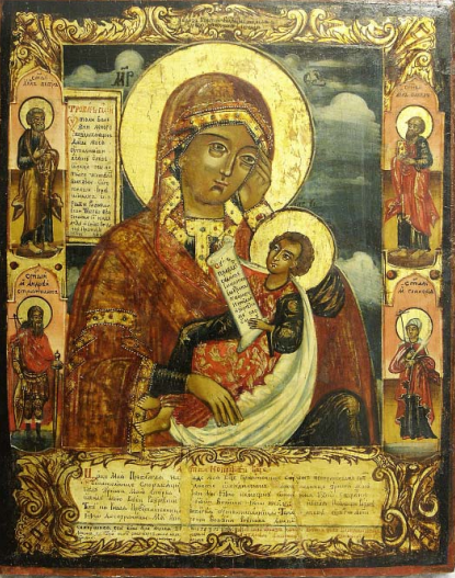 Краткое описание: в центре – поясное изображение Богоматери с полулежащим Младенцем. Правая рука Богоматери поднесена к щеке, левая – придерживает ножки младенца. В руках младенца – развёр нутый свиток. На боковых полях изображены слева – апостол Пётр и Андрей Стратилат, справа – апостол Павел и мученица Гликерия. На нижнем поле – прямоугольная рамка с текстом молитвы.