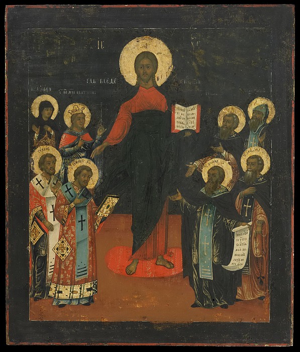 Спас оплечный (в окладе), в раме с 33 клеймами Господских и апостольских страстей