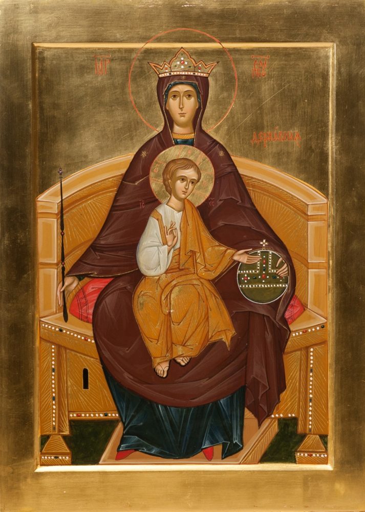 Этот образ Божией Матери был явлен русскому народу 15 марта 1917 года, в день отречения от престола царя-мученика Николая Александровича. Жительнице слободы Перерва крестьянке Евдокии Адриановой были два сновидения: первое 13-го февраля и второе 26-го февраля. 13-го февраля во сне был голос: „Есть в селе Коломенском большая черная икона. Ее нужно взять, сделать красной, и пусть молятся“. Благочестивая женщина стала молиться о получении более ясных указаний и спустя две недели, 26-го февраля, как бы в ответ на усердную молитву, Адриановой снится белая церковь, и в ней величественно восседает Женщина, в Которой своим сердцем Адрианова признает и чувствует Царицу Небесную, хотя и не видит Ее святого лика. Евдокия отправилась в Коломенское и сразу узнала виденную во сне Вознесенскую церковь. В подвале, среди старых досок, разных тряпок и рухляди, в пыли, и была найдена большая узкая старая черная икона. Когда почерневшую от старости икону промыли, открылось изображение Богоматери, восседающей на троне с Богомладенцем. Царица Небесная была написана со знаками царской власти: в красной порфире, с короной на голове и скипетром и державой в руках – откуда и произошло название “Державная”.