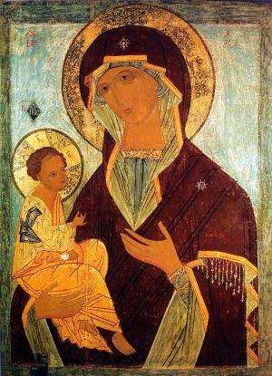 Иерусалимская икона Божией Матери, также называемая Гефсиманской или Корсунской, – одна из наиболее чтимых на Руси икон Богородицы. По легенде, икона была написана самим апостолом Лукой. Икона сначала хранилась в селении Гефсимания под Иерусалимом (отсюда названия Гефсиманская и Иерусалимская), в V веке ее увезли в Константинополь, в IX веке отправили в Корсунь (Херсонес), а святой равноапостольный Владимир перенес ее в Великий Новгород. Однако ученые датируют эту икону XI веком. В письменных источниках она была впервые упомянута в XV веке. Согласно летописи, икона хранилась в Софийском соборе Великого Новгорода и именовалась Корсунской, а почитаться как чудотворная стала после того, как пономарю собора ночью в видении явились молившиеся перед ней новгородские епископы прошлых веков. При Иване Грозном Корсунскую икону из Новгорода перенесли в Москву, в Успенский собор Московского кремля. В 1701 году икона была поновлена царским иконописцем Кириллом Улановым. В 1812 году, при нашествии Наполеона, икона исчезла, а в Успенский собор перенесли копию, сделанную Кириллом Улановым при поновлении иконы.