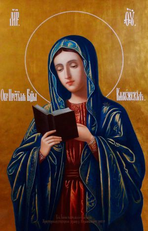 Калужская икона Божьей Матери – один из почитаемых на Руси чудотворных образов Девы Марии, покровительница Калужской земли. На этой иконе Божия Матерь изображена без Младенца, с книгой в руках. Образ был случайно обнаружен в селе Тиньково, неподалеку от Калуги, на чердаке помещика Василия Кондратьевича Хитрово его служанками. Девушки приняли икону Богородицы за портрет какой-то монахини, и одна из служанок, отличавшаяся вспыльчивым характером, плюнула на изображение. В ту же секунду ее разбил паралич. Ночью к ее родителям явилась Пресвятая Богоматерь и сообщила, что их дочь осквернила святой образ. Пречистая Дева велела старикам горячо молиться перед поруганной иконой. Исцелившись, служанка принесла покаяние, а икону поставили в доме помещика. Затем от святого образа получили исцеление глухой слуга Прохор и заболевшая дочь помещика. Благодарный хозяин пожертвовал святой образ в ближайшую церковь в селе Калуженка. В 1771 году после крестного хода с этой иконой прекратилась эпидемия моровой язвы. Икона защитила Калугу и в 1812 году от нашествия Наполеона. Пленные французы рассказывали, что время боев под Калугой и Малоярославцем им являлась Пресвятая Дева. После революции икона была конфискована, и ее судьба неизвестна. Долгое время считалось, что икону удалось сохранить в Московской духовной академии в Троице-Сергиевой лавре, а в 1998 году ее поставили в Георгиевском кафедральном соборе города Калуги. Однако, по последним данным, это был не сам чудотворный образ, а его копия.