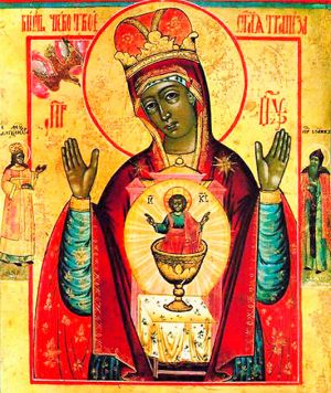 Икона Божией Матери Никейская — одно из древнейших изображений Богородицы. На иконе Дева Мария пишется с молитвенно поднятыми руками, а на Ее груди изображен храм со святым престолом. На престоле стоит Чаша со Святыми Дарами, а в чаше изображен Младенец. По внешнему виду Никейская икона близка к более новому прославленному образу — «Неупиваемой Чаше». По преданию, икона прославилась в Никее (ныне турецкий город Изник) в 304 году. Во время осады города военачальником Амиром некий воин по имени Константин начал глумиться над иконой: бросил камень в лик Божией Матери, а затем разбил икону и стал ее топтать. Ночью во сне ему явилась Богородица и сказала: «Ты учинил великое поругание Мне. Знай, что ты сделал это себе на погибель». Утром во время сражения он погиб, пораженный камнем в голову. Об этом рассказали святым отцам Первого Вселенского собора (325 год), которые постановили петь перед этим образом следующую молитву: «Стало чрево Твое, о Богородица, святою трапезой, носящей небесный Хлеб, Христа, Бога нашего, и никто из вкушающих от Него не умирает, как сказал Он, всех Питатель». Впоследствии часть этого песнопения стали писать на самой иконе, а преподобный Андрей Критский включил его в канон Преполовению Пятидесятницы.