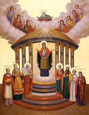 Киевская икона Пресвятой Богородицы «София – Премудрость Божия» – почитаемое в России изображение Пресвятой Девы из Софийского собора в Киеве, не сохранившееся до нашего времени, но существующее во множестве списков. Икона имеет сложную композицию, отражающую глубокое богословское содержание: она символически показывает, как через Божию Матерь воплощается Божественная Премудрость – Христос. На иконе изображен храм с крышей, поддерживаемой семью колоннами, внутри храма на облаке стоит Богоматерь с Младенцем на груди. Над крышей — Господь с архангелами, у подножия храма — ветхозаветные пророки, предсказавшие рождение Христа. По карнизу крыши идет надпись — цитата из Ветхого Завета: «Премудрость создала Себе Дом и утвердила семь столпов», на семи ступенях храма перечислены названия семи добродетелей: вера, надежда, любовь, чистота, смирение, благость и слава. Иконы этого типа получили распространение в конце XVII – начале XVIII века. Предположительно, автором первообраза был святитель Петр Могила. По другой версии, киевская икона Софии — Премудрости Божией является копией с греческого оригинала XVI века из патриаршей церкви в Константинополе.
