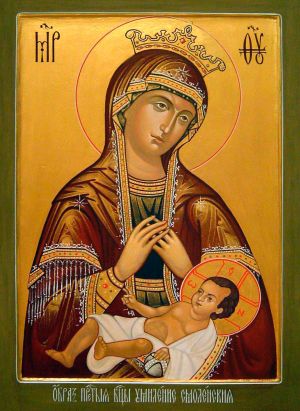 Под именем «Умиление» Смоленская известны две чтимые иконы, дни празднования которых в настоящее время совпадают. Одна из них, по преданию, была принесена в Смоленск из Грузии. Она прославилась в Смутное время, когда город осаждали поляки. Икона в это время находилась в лагере воеводы Михаила Шеина, и благодаря ее чудесной помощи русским войскам удавалось в течение 20 месяцев оборонять город. До Октябрьской революции икона пребывала в Спасо-Окопном храме г. Смоленска, после революции была утрачена. Другой образ Божией Матери «Умиление», хранившийся в той же церкви, известен благодаря своей необычной иконографии. На этой иконе Пресвятая Богородица изображена со сложенными на груди руками. Младенец лежит у Нее на коленях, держа в правой ручке державу – символ царской власти. Эта икона также исчезла после Октябрьской революции.