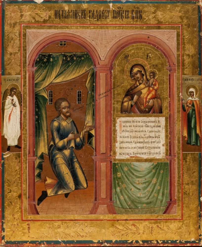 Икона Божией Матери „Всех скорбящих Радость“ стала известна с 1688 года, когда от нее, в царствование царей Иоанна Алексеевича и Петра Алексеевича, совершилось чудесное исцеление родной сестры патриарха Иова, Евфимии, жившей в Москве на Ордынке и страдавшей долгое время неизлечимой болезнью. Однажды, проснувшись рано утром, она долго и усердно призывала на помощь Спасителя и Божию Матерь. После молитвы болящая услышала голос: „Евфимия! В храме Преображения есть образ Мой, именуемый „Всех скорбящих Радость“. Призови к себе с этим образом священника и помолись: и ты получишь исцеление от своей болезни“. Пришедши в себя, больная узнала от родственников, что действительно в храме Преображения на Ордынке в Москве есть икона Богоматери „Всех скорбящих Радость“. Она подняла эту икону к себе в дом и получила исцеление. Это чудесное исцеление совершилось 6 ноября.