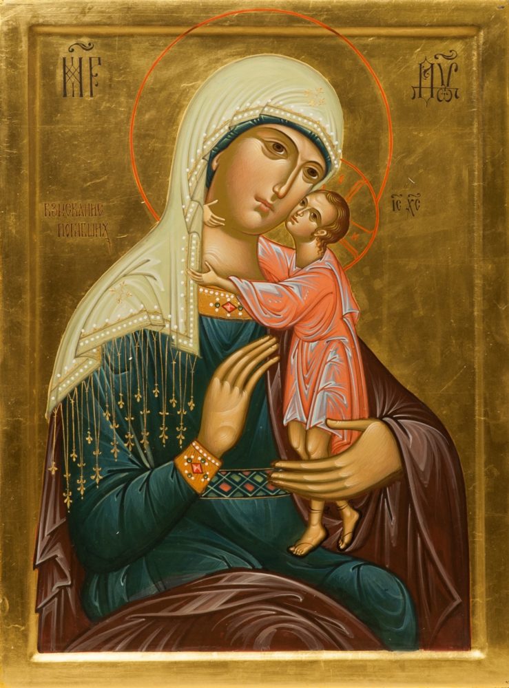 С незапамятных времен русский народ, свято веря во всесильную помощь Пресвятой Богородицы, усвоил Ей именование „Взыскание погибших“, как последнему прибежищу, последней надежде погибающих людей. О происхождении этого образа достоверных сведений не сохранилось. Известно несколько чудотворных икон под этим названием, через которые Матерь Божия являла Свою милость людям, уже переступившим порог гибели. Особенный интерес представляют сохранившиеся предания об иконе, находящейся в храме в честь „Воскресения Словущего“ в Москве. Эта икона была перенесена из храма в честь Рождества Христова в Палашевском переулке. Последний владелец ее овдовел и был на пороге полной нищеты. Усердная молитва Богородице спасла его от отчаяния и устроила судьбу его дочерей. Человек этот счел себя недостойным иметь в своем доме этот образ и передал его в храм. В 1812 г. Палашевский храм был разграблен французами. Поруганная святыня была найдена расколотой на три части среди всякого хлама. При обретении иконы совершилось множество чудесных исцелений. К этой иконе обращались невесты, выходя замуж, чтобы брак был спасительным, приходили к ней люди, погрязшие в пьянстве, погибающие в нищете, страждущие в болезнях, с молениями обращались к ней матери о погибающих детях. И всем Царица Небесная ниспосылала помощь и поддержку.