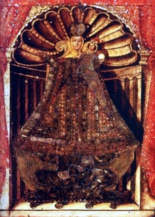 Образ очень редкой иконографии находится в Третьяковской галерее. Повторяет чудотворный образ Богоматери Лоретской, известный с XVI века и связанный со Сказанием о странствующем Доме Богородицы. По преданию, Дом Божией Матери был перенесён ангелами из Назарета в Италию и явился 10 мая 1291 года в местечке Рауница в Далмации. Там в каменной сводчатой нише и был обретён чудотворный образ, получивший позже название Богоматери Лоретской. 10 декабря 1294 года Дом переместился из Далмации и появился в провинции Анкона около города Реканати, а позже в 1295 году его обрели недалеко от города. До 1507 года это чудо не было признано даже папами. До конца XVI века о нём ничего не было известно и на востоке. Чудотворный образ Богородицы Лоретской представлял собой не икону, а скульптурное изображение, вырезанное из кедрового дерева, по преданию, евангелистом Лукой. У Младенца правая рука благословляет, в левой — держава. На голове Богоматери жемчужный венец, волосы распущены. Скульптура была раскрашена и инкрустирована бриллиантами и драгоценными камнями. Икона Третьяковской галереи выполнена на тонком иконном щите (две доски, две накладные шпонки, без ковчега) в сложной комбинированной технике темперной живописи в сочетании с инкрустацией перламутром с применением подкраски для придания перламутру различных оттенков. Использование художником нетрадиционной техники, а также монументальность образа дают возможность предположить, что в качестве прототипа послужил не живописный оригинал. Композиция иконы близка к скульптурному изображению Богоматери Лоретской, она воспроизводит даже её расположение в интерьере итальянской церкви. Иконографическими особенностями образа являются красная драпировка, крест в правой руке Богородицы, а также полностью скрытые под платом и короной волосы, что говорит о творческой переработке первообраза.