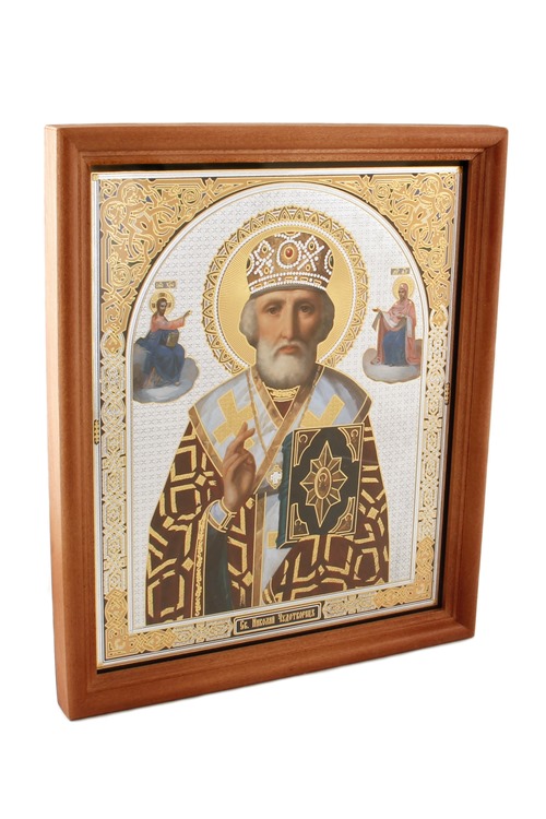 Главная > Иконы > zyorna.ru > Николай Чудотворец с предстоящими икона под стеклом (20х24 см, Софрино)