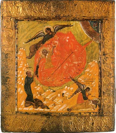 Огненное восхождение Ильи-пророка, с тремя святыми на полях