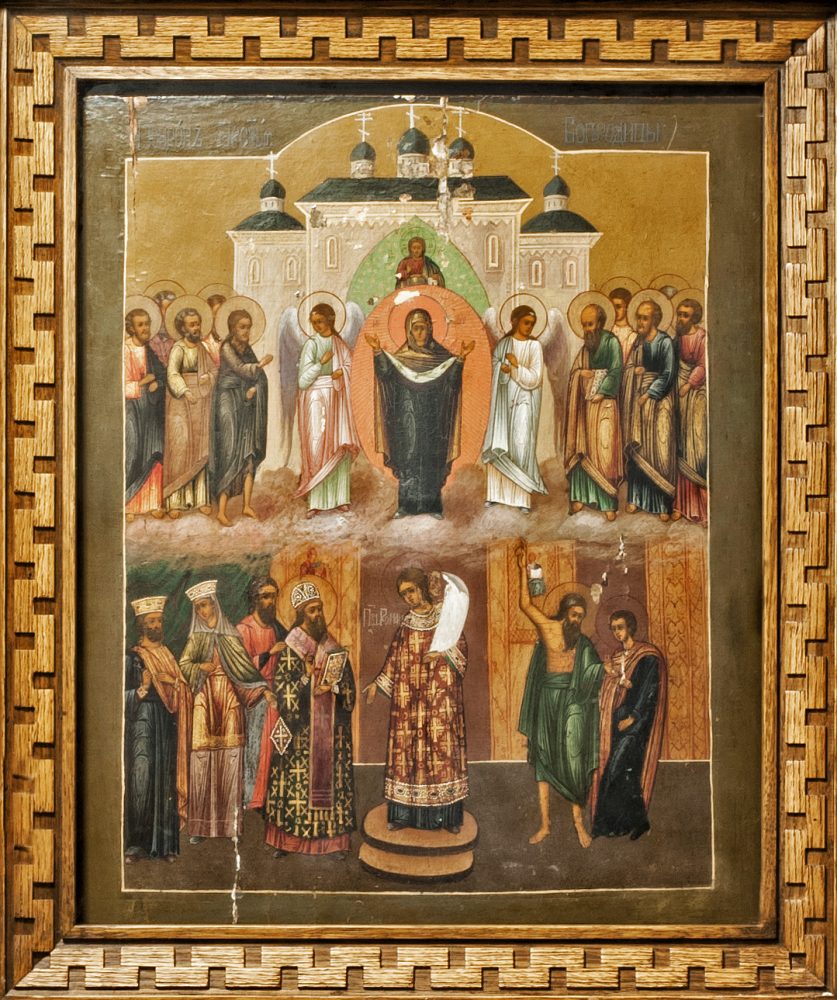 В середине Х в. в Константинополе произошло чудное явление Божией Матери. В воскресный день, 14 октября, во время всенощного бдения, когда Влахернская церковь была переполнена молящимися, св. Андрей, Христа ради юродивый, подняв очи к небу, увидел идущую по воздуху Пресвятую Богородицу, озаренную небесным светом и окруженную Ангелами и сонмом святых. Св. Креститель Господень Иоанн и св. aп. Иоанн Богослов сопровождали Царицу Небесную. Преклонив колена, Пресвятая Дева начала со слезами молиться за христиан и долгое время пребывала в молитве, потом, подойдя к Престолу, продолжала Свою молитву, закончив которую, Она сняла со Своей головы покрывало и распростерла его над молящимися в храме людьми, защищая их от врагов видимых и невидимых. Пресвятая Богородица просила Господа принять молитвы всех людей, призывающих Его Пресвятое Имя и прибегающих к Ее заступлению. Св. Андрей и Епифаний долгое время смотрели на распростертое над народом покрывало и на блиставшую наподобие молнии славу Господню; доколе была там Пресвятая Богородица, видимо было и покрывало; по отшествии же Ее, сделалось и оно невидимым, но, взяв его с Собою, Она оставила благодать, бывшую там.