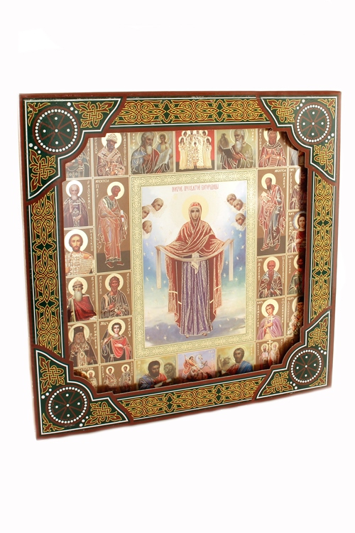 Главная > Иконы > zyorna.ru > Покров с предстоящими икона Божией Матери под стеклом (26х26 см)