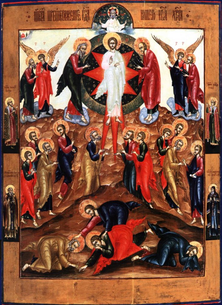 Преображение Иисуса Христа на горе Фавор представлено в пространном варианте, с восходящими на гору и сходящими с нее Христом и апостолами. Уникальная деталь – изображение Христа, склонившегося к упавшим апостолам, чтобы помочь и мочнуться. Произведение является образцом традиционной профессиональной иконописи нижегородских мастеров XIX в. Представляет иконографический интерес, имеет художественное и историко-культурное значение