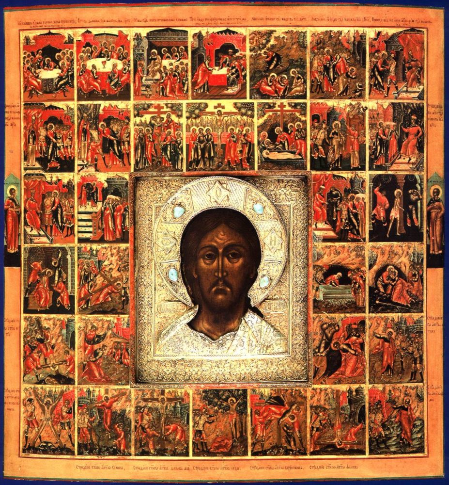 Икона Спаса украшена окладом с мелким растительно-геометрическим орнаментом. Накладной венец украшен бирюзой (4 камня). На раме в 21 клейме изображены Страсти Христовы, начиная с Тайной вечери и кончая Опечатанием гроба. Ниже-12 клейм Апостольских страданий. На полях – мученики Христофор и Вонифатий. По-видимому, число клейм – 33 – наделялось сакральным смыслом – это возраст Христа в то время, когда Он принес себя в жертву во имя спасения человечества. Мученики на полях – помощники заказчика в противостоянии болезням и пагубным страстям. Икона в окладе и в живописной раме является памятником живописи и прикладного искусства XVI11 -XIX веков. Особенно высокими художественными достоинствами обладает рама. Памятник интересен поиконографии, представляет художественную и музейную ценность.