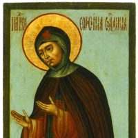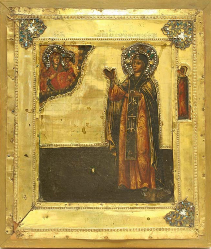 Краткое описание: святая представлена в рост, в молении перед Бого матерью с Младенцем, изображённой в «облачном» сегменте, в левом верхнем углу. На правом поле изображена святая Ирина. Оклад на по лях и фоне золочёный, гладкий, украшен чеканным бордюром из цве тов. На полях – три сканых наугольника с цветной эмалью. Венцы Богоматери и Евфросинии сканые, с эмалью и цветными стёклами.