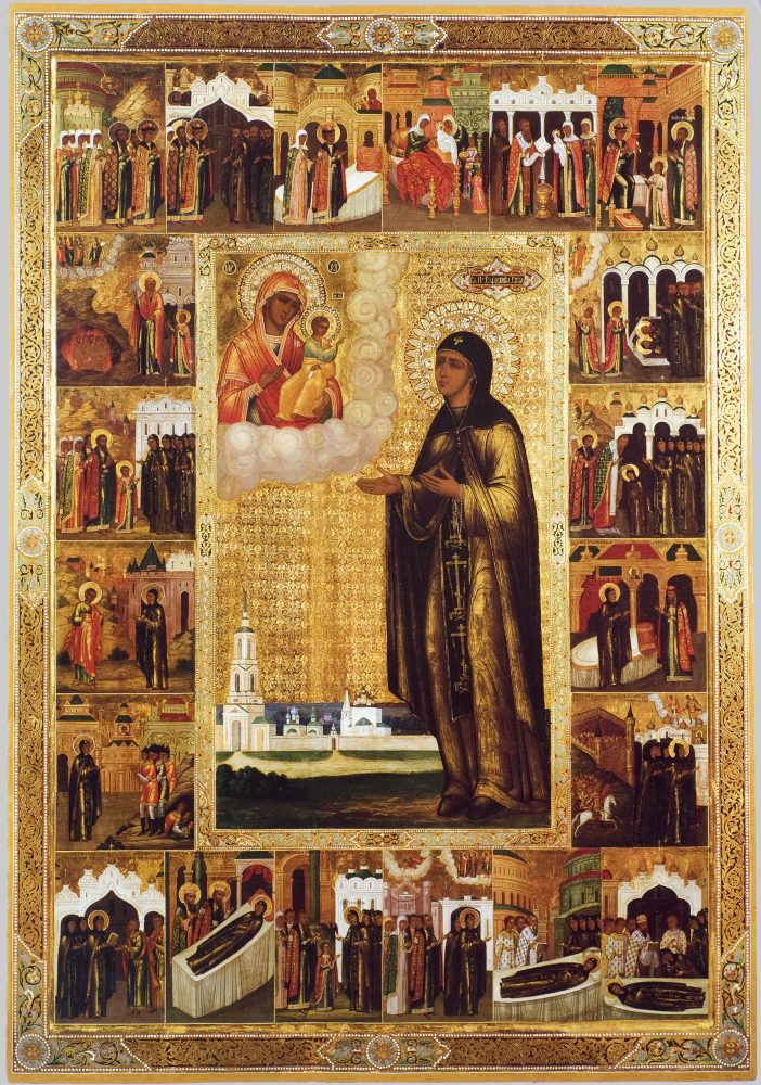 Краткое описание: в среднике в рост, вполоборота влево изображена святая Евфросиния, предстоящая Богоматери с Младенцем, изображен ной в «облачном» сегменте, в левом верхнем углу. Внизу, в картуше, – текст кондака святой. На полях – 20 клейм со сценами жития Евфро синии: 1) Князь Михаил с княгиней и боярами идёт из Чернигова в Киев; 2) Князь Михаил «молится о бесчадии» в Печерском монастыре; 3) Явление Богоматери князю Михаилу; 4) Рождество Феодулии; 5) Кре щение Феодулии; 6) Научение грамоте; 7) Явление Богоматери княжне Феодулии; 8) Видение Феодулии; 9) Вхождение Феодулии в Ризполо женский монастырь; 10) Пострижение Феодулии; 11) Явление Христа Евфросинии; 12) Явление дьявола в образе отца; 13) Явление дьявола в образе етера; 14) Избавление монастыря от войск хана Батыя; 15) Ев фросиния посылает отцу книги; 16) Явление Михаила Черниговского и Феодора пр. Евфросинии; 17) Изгнание беса из девицы (?); 18) Избав ление Суздаля от «труса»; 19) Преставление Евфросинии; 20) Погребе ние Евфросинии.