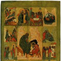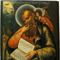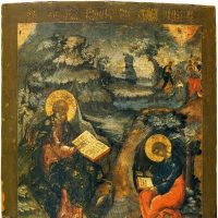 Краткое описание: в среднике – поколенное изображение Иоанна Богослова с Евангелием и пером в правой руке. Слева за плечом свято го – Ангел, справа – орёл с чернильницей.