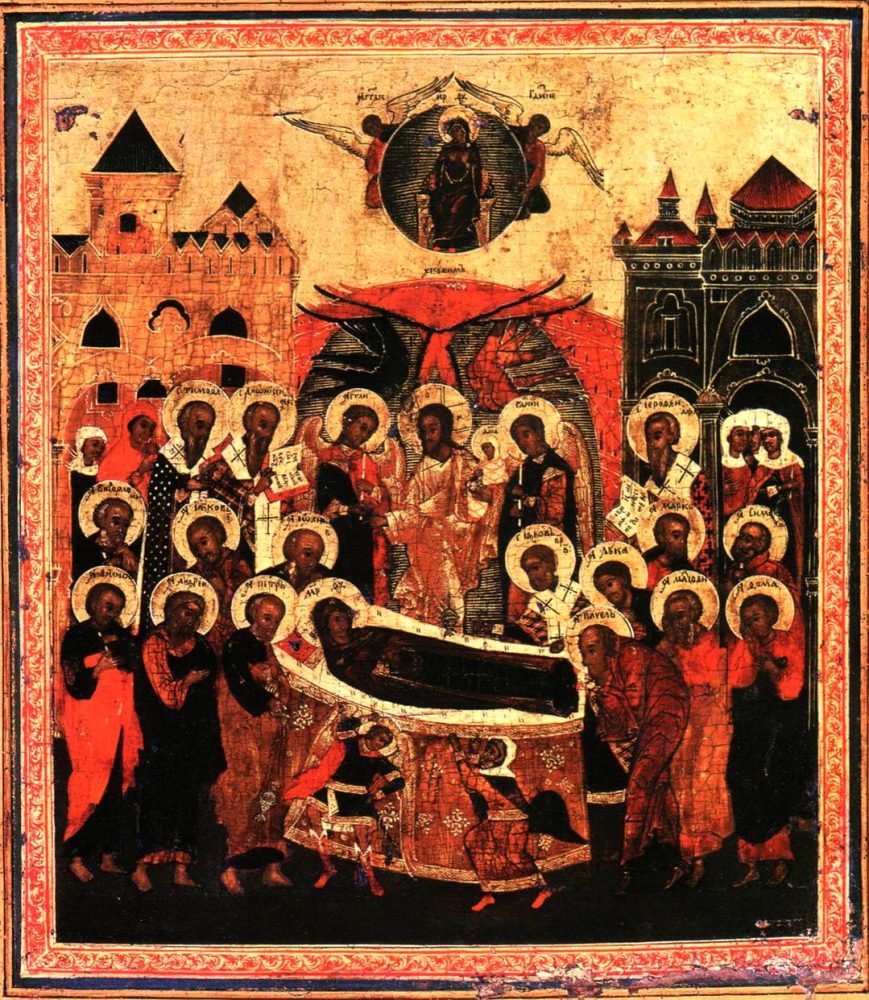 Успение Богоматери представлено со сценой отсечения архангелом рук иудею Авфонию. Христос, держащий спеленатую душу Пресвятой Девы, окружен сферой спредстоящими архангелами, с херувимами и огненным серафимом вверху. Егоблагословляющая десница опущена над Богородицей. Подобная деталь появляется врусской иконописи во второй половине XVII в. За сферой – красная стена города. Над нею -возносящаяся Богоматерь, на престоле, в мандорле, поддерживаемойдвумя ангелами. Христу и возлежащей Богоматери предстоят апостолы, святителии жены иерусалимские. Икона является произведением русской живописи XVII в.,с поновлениями XIX в. Представляет художественную и историко-культурнуюценность