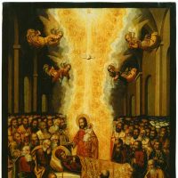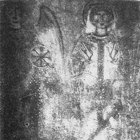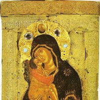 Слева на фоне архитектуры – стоящая Богоматерь, с посохом, за нею – апостолы Петр и Иоанн. Справа на фоне архитектуры – предстоящий ей преподобный Сергий, за ним – преподобный Никон. Вверху в темно-зеленой небесной сфере – изображенная монохромно Троица Ветхозаветная. На окладе имеется клеймо с датой – 1875 год. Памятник является характерным произведением мастерских Троице-Сергиева монастыря, писавших иконы „Сергиева видения“ для продажи паломникам.