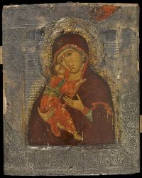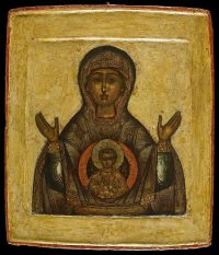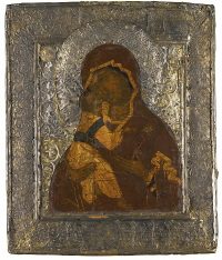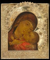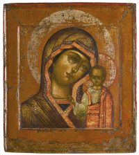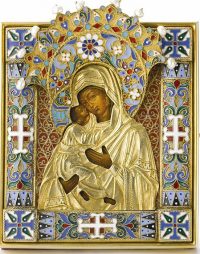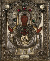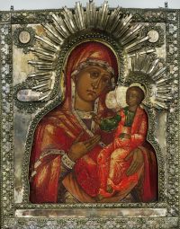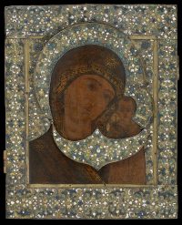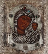 Икона Божией Матери Казанская в серебряном окладе с жемчугом