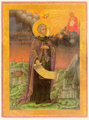 Преподобный Павел Ксиропотамский, в миру Прокопий, был сыном Константинопольского императора Михаила Куропалата, который впоследствии сложил с себя царское достоинство и принял иночество в построенном им монастыре. Получив блестящее образование, Прокопий стал одним из ученейших людей своего времени. Его Слово на Введение во храм Пресвятой Богородицы, канон Сорока мученикам, канон Честному Кресту и другие труды снискали ему заслуженную славу. Но ученость и почетное положение в свете не увлекли Прокопия. Оставив все мирское, сменив богатые одежды на нищенское рубище, он ушел на Святую Гору, на место Ксиропотам, построил себе келлию в развалинах разоренной обители, основанной некогда царицей Пульхерией в честь 40 мучеников, и принял от пустынника Космы постриг с именем Павел.