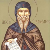 Преподобный Венедикт, основатель западного монашеского ордена бенедиктинцев, родился в итальянском городе Нурсии в 480 году. В 14 лет святой был отправлен родителями на ученье в Рим, однако, угнетенный окружавшей его безнравственностью, он решил посвятишь себя другой жизни. Вначале святой Венедикт поселился при церкви святого апостола Петра в селении Еффеди, но молва о его подвижнической жизни заставила его уйти дальше в горы. Там он повстречал отшельника Романа, который постриг его в монашество и указал ему для жительства отдаленную, пещеру. Время от времени отшельник приносил святому пищу. Три года в полном уединении святой вел суровую борьбу с искушениями и превозмог их. Вскоре к нему стали собираться люди, жаждавшие жить под его руководством. Число учеников настолько выросло, что святой разделил их на двенадцать общин. Каждая община состояла из двенадцати иноков и составила отдельный скит. Каждому скиту преподобный дал игумена из своих опытных учеников.У преподобного остались ради назидания только новоначальные иноки. Строгие правила, установленные для монахов святым Венедиктом, не всем пришлись по душе, и преподобный не раз становился жертвой клеветы и преследований.