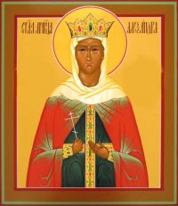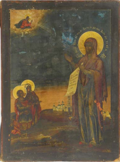 Краткое описание: Богоматерь со свитком в руке представлена в моле нии перед «облачным» Спасом, изображённым в левом верхнем углу. Слева – коленопреклонённые мученики Димитрий Солунский и Алек сандра. На фоне – панорама монастыря.