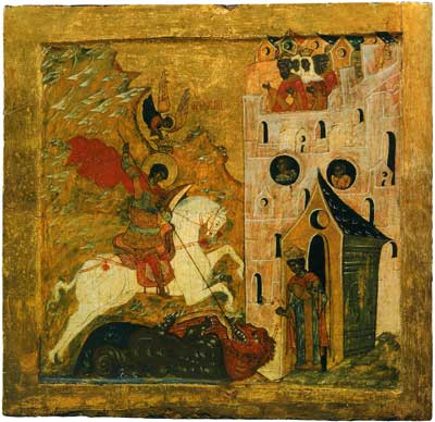 Чудо святого Георгия о змие, с Параскевой пятницей и Николой Чудотворцем на полях. 17 век