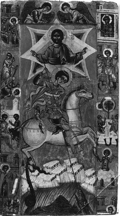 Св. Георгий перед царем. Прободение св. Георгия копьем