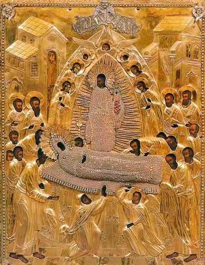 Псково-Печерская икона Успения Пресвятой Богородицы — главная святыня Псково-Печерского монастыря, покровительница и защитница всей псковской земли наряду с другойПсково-Печерской иконой – «Умиление» . Икона Успения Пресвятой Богородицы прославилась в 1473 году: в день освящения Успенского пещерного храма (в будущем — главный храм Псково-Печерского монастыря), который пришелся на праздник Успения, от нее совершилось первое чудо — излечилась больная женщина. По другой версии, икона была написана для монастыря в 1521 году псковским иконописцем Алексием Малым по заказу купцов Василия и Федора — тех же самых, которые принесли в дар обители икону «Умиление». Все время пребывания этой иконы в обители перед ней происходили чудеса и исцеления. Молитвы перед этой иконой помогли в спасении Пскова в 1581 году, во время Ливонской войны. Перед осадой города войском короля Стефана Батория Пресвятая Богородица явилась во сне благочестивому старцу Дорофею и велела доставить из Псково-Печерского монастыря две святыни — чудотворные иконы «Успение» и «Умиление». Иконы принесли в город и стали служить перед ними молебны. Враги долго осаждали и пытались штурмовать Псков, но так и не взяли его. В 1812 году городу снова угрожал враг: армия Наполеона взяла Полоцк и продвигалась к Пскову. 7 октября в город были доставлены иконы «Успение» и «Умиление», их пронесли крестным ходом вокруг города, и в тот же день русские войска отбили Полоцк, остановив тем самым наступление французов на Псков.