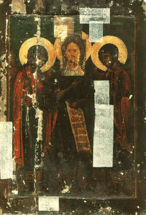 Сохранность. Шпонки утрачены. Утраты левкаса до доски по верхнему и левому полям. Утраты левкаса до паволоки по стыку досок. Многочисленные поздние вставки левкаса. В пробной расчистке на лике Христа утрата позолоты нимба, потертости живописи. Икона не раскрыта.