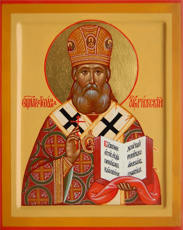 О, всеблаженне святый священномучениче святителю отче наш Иоанне, правды Божия поборниче и святыя православныя веры Христовой защитниче, хулителей Святыя Церкве обличителю, врагов прогонителю, обидимым покровителю и всех верных христиан теплый предстателю. Ты всею душею от юности заповеди Христовы возлюбил еси. И во дни гонения лютаго на веру Православную, яко истинный пастырь явился еси, крестный путь прошед: поругание, заточение, оклеветание претерпевый и тако мученический венец восприял еси, обретши благодать Господу молитися за ны. Вемы, яко ты, предстоя Престолу Вседержителя, имаши велие дерзновение в молитвах пред Господем. И ныне смиренно припадаем и усердно молимся: о, скорый заступниче наш, святителю священномучениче отче Иоанне, услыши нас грешных и недостойных чад твоих: умоли Всемилостиваго Господа и Пречистую Его Матерь Пресвятую Богородицу веру православную соблюсти, Святую нашу Церковь укрепити в единстве мира и любви, отпадшия от Святыя Церкве паки возвратити, страну нашу Латвийскую в мире, христианских добродетелех и благоденствии сохранити. Помози нам и разум наш питати не суетною мудростию человеческою, но смиренным познанием воли Божия. О, святый угодниче Божий, не презри нас молящихся тебе: не токмо от бед и скорбей избавления просим, но силы и твердости, великодушия и любве, дабы претерпети оныя напасти восстающия на ны. Испроси нам неослабное терпение до конца жития нашего, мир с Господем и грехов наших прощение. Ей, святый священномучениче, моли Господа Бога и Спаса нашего Иисуса Христа Сына Божия избавитися нам от всякаго зла и сохранити храм сей, и град, и страну нашу, и люди благочестно чтущия тя от всякия напасти, от болезней, глада, потопа, огня, меча, нашествия иноплеменников и междоусобныя брани, от клеветы и всякаго злаго обстояния. Молитвами твоими святыми рассеянныя собери, заблудшия на путь правый настави, старость поддержи, юныя вразуми, младенцы воспитай и всех нас с любовию почитающих тя утверди, да пребудем в любве друг ко другу, единомысленно исповедуя Отца и Сына и Святаго Духа, Троицу Единосущную и Нераздельную, и тако да сподобимся Небеснаго Царствия, идеже славится Пречестное и Великолепое Имя Пресвятой и Живоначальной и Нераздельной Троицы. Аминь.