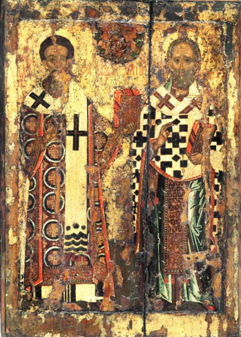 Сохранность. Основа иконы с боковых и верхнего торцов укреплена допол7 нительными деревянными планками. Утраты до доски на полях, фоне и на изображении фигур и лике Иоанна Златоуста. Многочисленные реставрационные вставки. Утраты золота. Потертость авторской живописи. Недобранные при раскрытии остатки поздних записей и олифы. Изображение “Отечества” вверху на фоне – поздняя живопись.