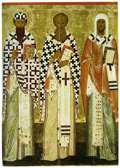 Главная > Иконы > Новгород, Новгородский гос. историко-архитектурный и худо­жест­вен­ный музей-заповедник, Россия > Кирилл и Афанасий Александрийские, Леонтий Ростовский