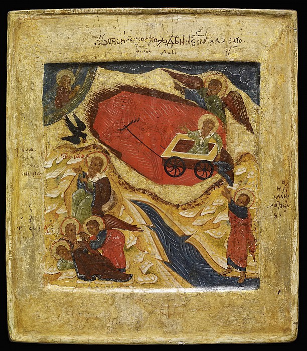 Огненное восхождение Ильи-пророка, с тремя святыми на полях