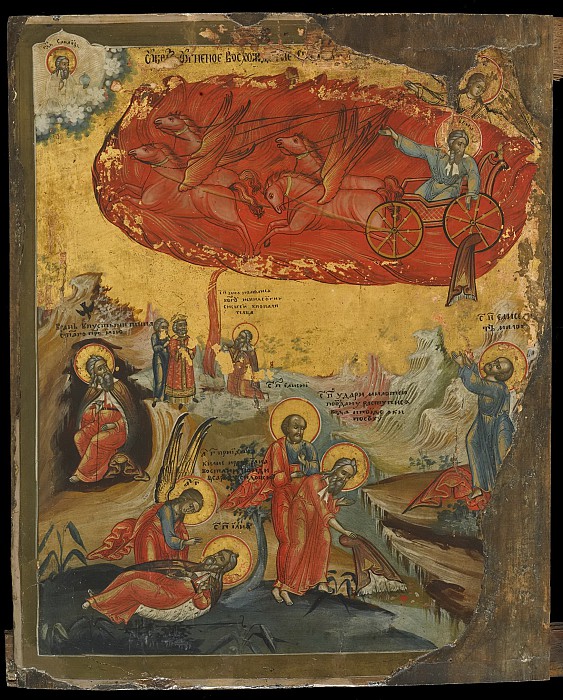 Огненное восхождение Ильи-пророка, с тремя святыми на полях