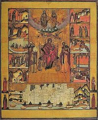 Богоматерь Экономисса, с житием прп. Афанасия Афонского и видом Великой лавры на Афоне