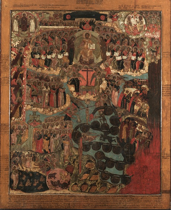 Богоматерь на троне, Христос на троне, двенадцать апостолов в медальонах