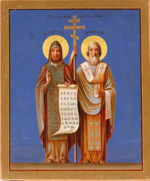 Краткое описание: святые изображены фронтально, в рост, поддержи вают свиток, на котором написаны буквы славянского алфавита. Слева представлен Кирилл, в монашеской рясе и мантии. Справа – Мефодий, в ризе и фелони с омофором, правой рукой поддерживает выносной восьмиконечный крест, в левой – золотой потир.