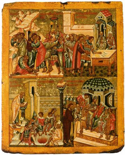 Главная > Иконы > Государственная Третьяковская галерея, Москва, Россия > Целование Иуды. Христос перед Каиафой и Анной. Отречение апостола Петра. Приведение Христа на судилище к Понтию Пилату