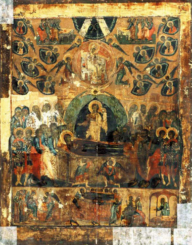 Конец XVI в. Ярославль (?) Дерево, основа состоит из четырех досок, скрепленных двумя врезными, несквозными, разносторонними шпонками. Ковчег, левкас, темпера. 117 х 90 И-1238