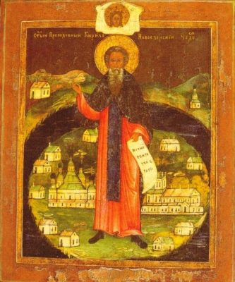 По смерти отца Кирилл, раздав нищим оставшееся после него имение, отправился на север, в глушь лесов, чтобы здесь вести вполне единенную жизнь. Сурово протекала жизнь преподобного в этих пустынях, где пищей ему могли служить только трава да кора деревьев. Отсюда приходил он иногда на поклонение святым местам в новгородские и псковские пределы. Так как тело его стало постепенно ослабевать в подвигах, то он молил Господа, чтобы Он указал ему место постоянного пребывания. Горячая молитва подвижника была услышана, и, повинуясь небесному указанию, св. Кирилл отправился к Белоозеру. Здесь с одной горы он увидел Новое озеро и на нем Красный остров. Явившийся подвижнику во сне ангел дал ему указа-ние, что здесь Бог избирает ему место пребывания. Пробудившись от сна, Кирилл твердо решил основать на Красном острове Божью обитель, для каковой цели и приобрел вскоре от местных крестьян указанный остров; затем соорудил здесь келью и две церкви. Тогда же он был поставлен в сан священника.