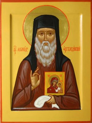 Леонид родился в 1551 году в Новгородской области, Пошенского уезда в Щекинской веси, от отца селянина, именем Филиппа и матери Екатерины. Имея от роду около 50 лет, видел он чудный сон, повелевавший ему идти в бывшую на Двине Моржевскую Николаевс-кую пустынь, и взять оттуда икону пресвятой Богородицы Одигитрии, перенести ее Усольский (ныне Сольвычегодский) уезд на реку Лузу к Турине горе, и там, устроив храм во имя иконы Одигитрии, оставаться. Почитая это откровение случайным сновидением, Леонид не решался на исполнение, и вместо того пошел в бывший Новгородский Козеозерский (Кожеозерский) монастырь, постригся (1603 г.) и жил там целый год. Оттуда отправился в Соловецкий монастырь, также прожил три года, труждаяся в пекарне; наконец будучи убежден повторяющимся ему сновидением, пошел в Николаевскую Морже-горскую пустынь, и пробыв там целый год в монастырских трудах, открыл настоятелю видение свое. Получив икону Одигитрии, Леонид пошел на назначенное место к реке Лузе, и поселился близ Туриной горы, при реке Якушице, в хижине, из хвороста сплетенной. Но тамош-ние жители изгнали его, и он отошел по реке Лузе оттуда на два поприща; с помощью одного селянина срубил себе келью и близ нее устроил часовню; после того сходил в Ростов для испрошения от мит-рополита Ростовского, Варлаама, антиминса и благословения на устроение церкви. Получив антиминс, он возвратился на место, посвя-щенный в иеромонаха; создал (1608 г.) деревянную церковь во имя Введения Божией Матери, и поставил в храме вышепомянутую икону Одигитрии. Болота, окружавшие устроенную им обитель делали ее неудобною для общежития; для осушения оных Леонид прокопал от реки Лузы канал в Черное озеро, и прозвал его Недумою рекою, по следующему случаю. При рытии канала, Леонид ужален быль змеею. В минуту уязвления родилась мысль о гибельных последствиях яда, и привела было Леонида в страх. Вдруг возложа упование на Бога, решился он об опасности не думать и остался здоров. Тогда преподоб-ный приступил к новой работе. Он прокопал еще два канала: от Черного озера до Святого, а от Святого озера до Черной речки; таким образом эту речку, вытекающую из непроходимых лесных болот, провел в реку Лузу. Но несмотря однако и на этот совершенный труд, нельзя было осушить место, ибо весенняя вода, во время разлива реки Лузы, потопляла монастырь. Это заставило перевести обитель на один мыс над Черным озером, при речке Недуме. На новом месте поставил Леонид, с благословения Ростовского митрополита, церковь Введения с приделом великомученицы Параскевы, нареченной Пятницы. Церковь Введенская освящена архимандритом Устюжского Архангельского монастыря, Арсением, 1652 г. мая 25. По устроении Устьнедумской обители, преподобный Леонид скончался в 1654 г. 17 июля, на 105 году от рождения. Власяница его доныне сохраняется в бывшей монастырс-кой, а ныне приходской Богородицкой церкви. В монастыре, с самого его основания преподобным Леонидом, бывал съезд богомольцев в девятую пятницу по пасхе.