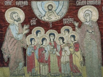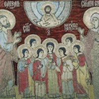 Были схвачены и семь учеников святого Елеазара, братья Маккавеи Авим, Антонин, Гурий, Елеазар, Евсевон, Алим и Маркелл, и с ними их мать Соломония. Их привели к беззаконному царю и также стали принуждать есть недозволенную пищу. Тогда один из них, отвечая за всех, сказал: «Мы готовы лучше умереть, чем преступить законы». Царь приказал отрезать ему язык, содрать с тела кожу и отсечь руки и ноги на виду у прочих братьев и матери. Лишенного всех членов, но еще дышащего юношу бросили на огромную раскаленную сковороду. Когда умер первый, вывели на поругание второго, и он принял мучение таким же образом. Уже при последнем издыхании он сказал: «Ты, мучитель, лишаешь нас настоящей жизни, но Царь мира воскресит нас, умерших за Его законы, для жизни вечной». Когда мучили третьего и хотели ему отрезать язык, он тотчас выставил его, неустрашимо протянув и руки, и мужественно сказал: «От Бога я получил их, и за законы Его не жалею их, и от Него надеюсь опять получить их». Даже мучители были изумлены таким мужеством юноши. Потом славную мученическую кончину приняли еще трое братьев Маккавеев. Седьмому же, самому младшему, мать их святая Соломония сказала: «Умоляю тебя, дитя мое, посмотри на небо и землю и познай, что все сотворил Бог из ничего и что так произошел и род человеческий. Не страшись этого убийцы, но будь достойным братьев твоих и прими смерть, чтобы я по милости Божией опять приобрела тебя с братьями твоими». После сыновей скончалась и мать, радостно благодаря Бога за то, что она сама и дети положили души за закон Господа Вседержи-теля.