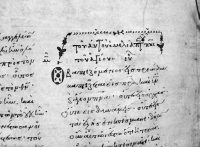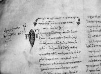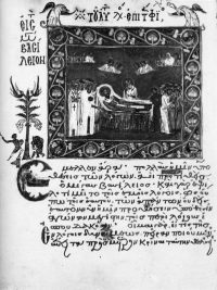 Заставка с изображением кончины Василия Великого и фигурный инициал с изображением св. Григория, произносящего речь над гробом Василия