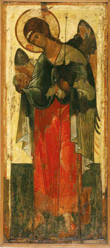 Сохранность. Нижняя шпонка утрачена, по нижнему краю древесина сильно изъедена жуком7точильщиком. Нижнее поле опилено. Икона заключена в зажимную раму. Крупные утраты до древесины на верхнем поле и нимбе архангела, по стыку досок, на поземе и полях в правой нижней четверти, на нижнем поле, фоне и одеждах архангела. Утраты живописи на крыльях. Светлые участки живописи — ХV в., темные-ХVI в., на левой щеке архангела — вставки живописи ХХ в.
