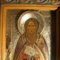 Преп. Сергий Радонежский, на полях: Сщ.м.Харлампий, ап. Симон Кананит, прп. Марко Фряжский, прп. Петр Афонский (XVIII век, запись ХХ век)