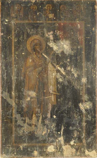 Краткое описание: Богоматерь изображена в рост, вполоборота к изоб ражённому в правом верхнем углу Спасу. На верхнем поле – поясной пятифигурный «Деисус».